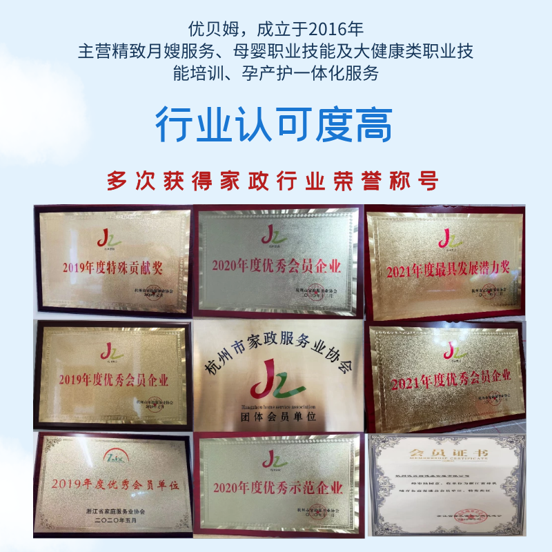 杭州優(yōu)貝姆健康管理有限公司,成立于2016年,是一家致力于打造集定制居家月嫂服務(wù)、孕產(chǎn)護(hù)一體化服務(wù)、母嬰健康管理培訓(xùn)學(xué)校為一體的現(xiàn)代化母嬰健康管理企業(yè)。 連續(xù)多年被浙江省家政協(xié)會(huì)及杭州市家政協(xié)會(huì)評(píng)為:“優(yōu)秀會(huì)員單位”“家政示范企業(yè)”“特殊貢獻(xiàn)獎(jiǎng)”等殊榮。 多次在浙江省家政技能比賽中獲得優(yōu)異成績(jī),并代表浙江省參加“長(zhǎng)三角家政技能大賽”并取得優(yōu)異成績(jī)。